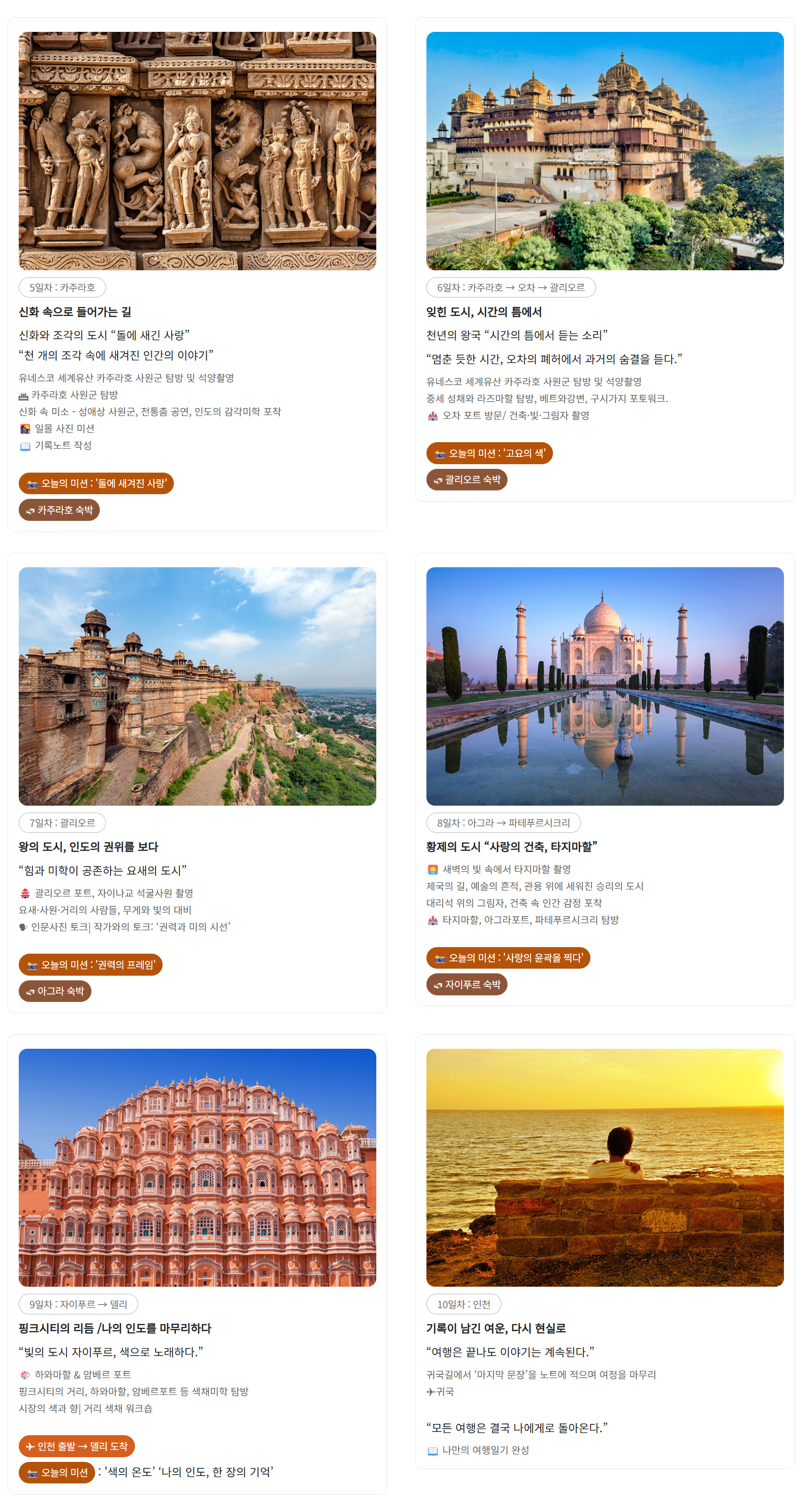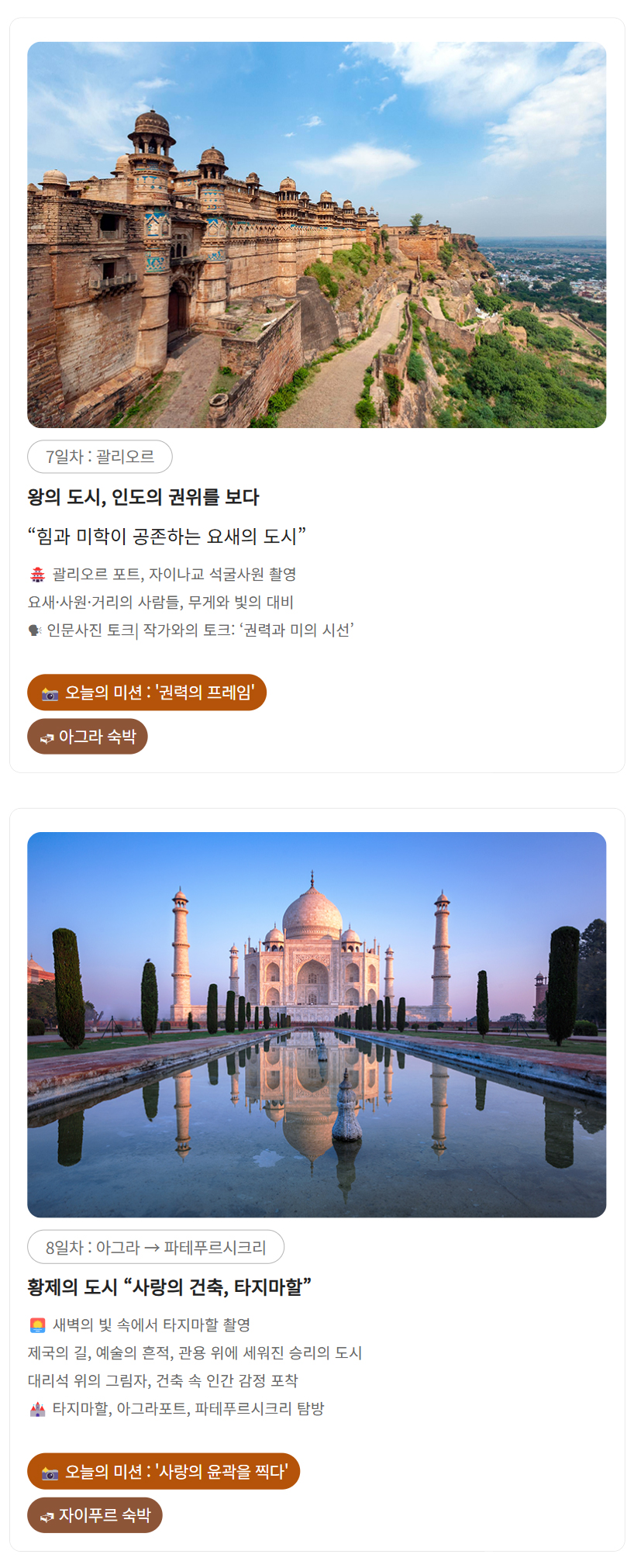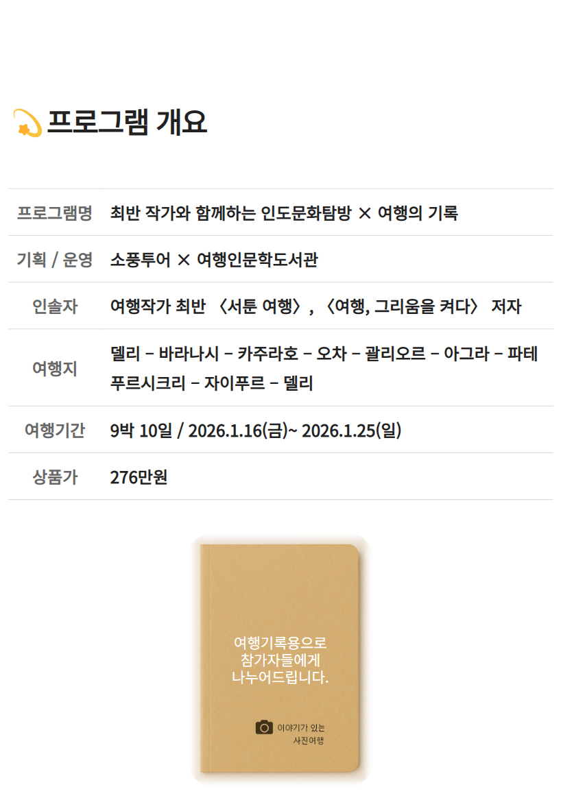 상품 특전 | 노쇼핑 & 노옵션 전 일정 여행작가 & 사진작가 길벗 동행 현장 실습형 사진 피드백 (구도·노출·색감·편집) 포토에세이 구성 코칭 (사진 선별·문장 다듬기) 길위의꿈 여행인문학도서관 포토 토크쇼 &전시회 여행의 기록노트 제공 골든 트라이앵글 5대 유네스코 세계문화유산 및 괄리오르 포트 바라나시 사이클릭샤 투어 바라나시 갠지스강 보트투어 * 상기 이벤트는 현지사정에 의해 변동될 수 있습니다. |