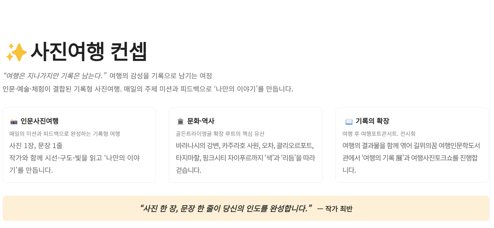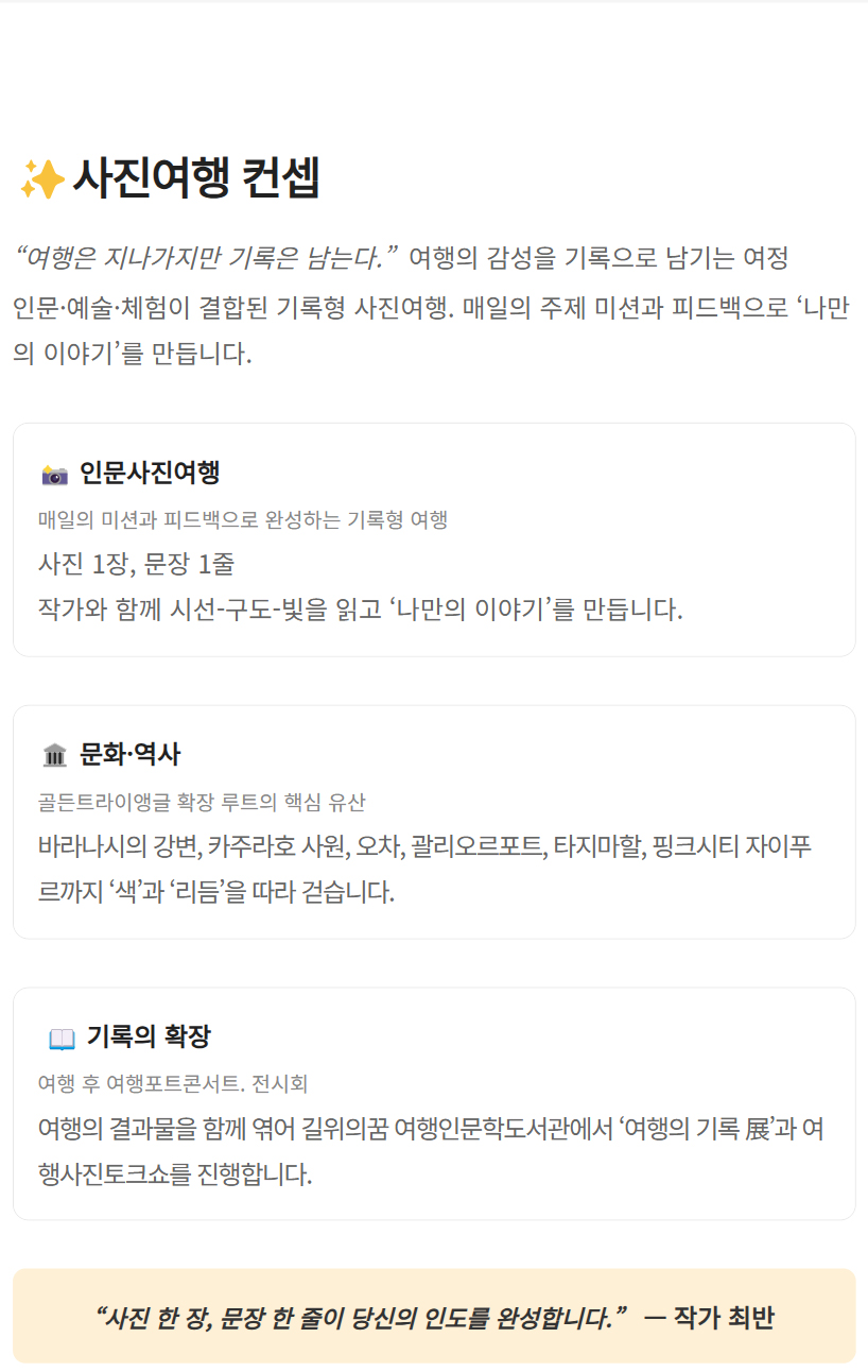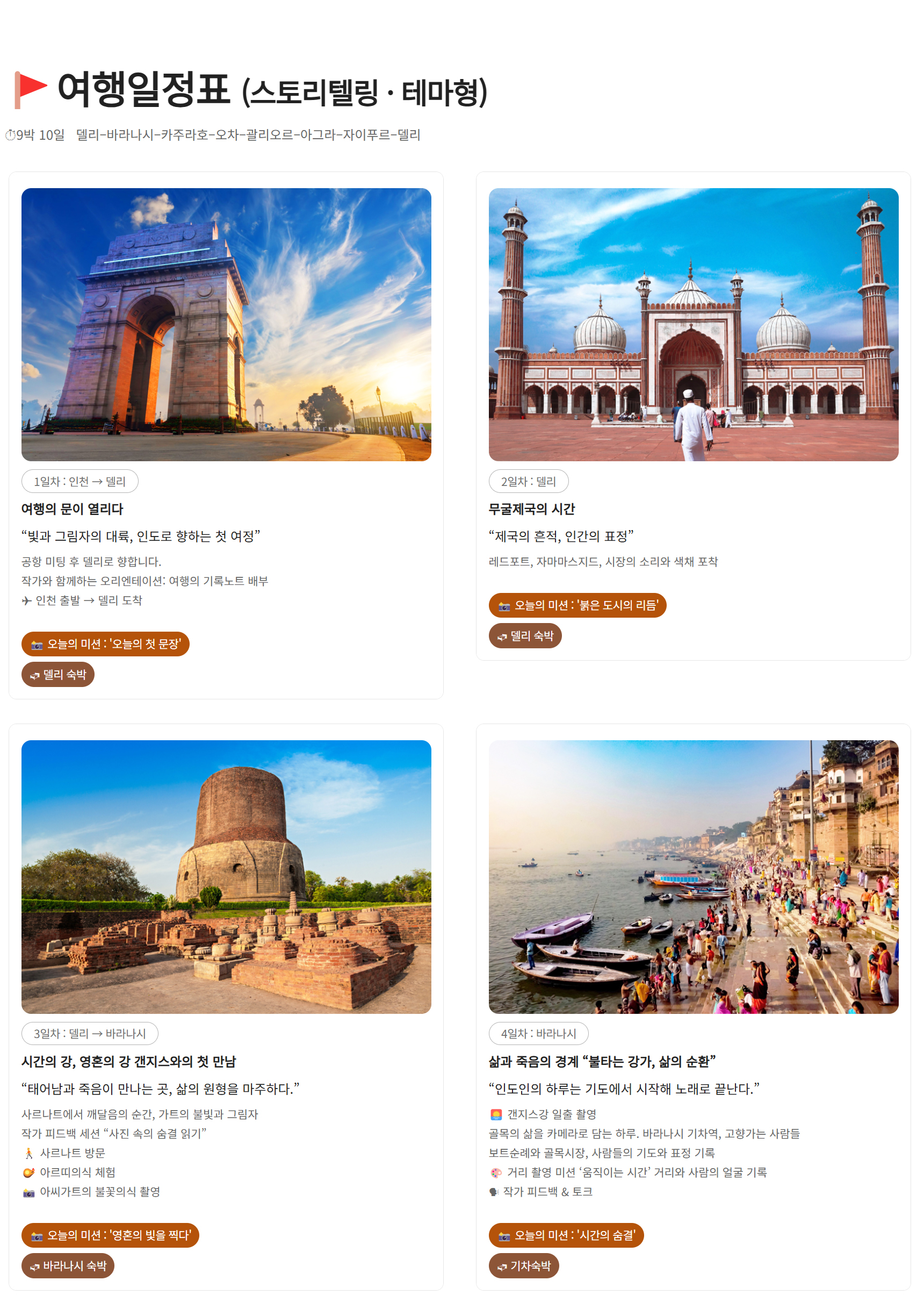 상품 특전 | 노쇼핑 & 노옵션 전 일정 여행작가 & 사진작가 길벗 동행 현장 실습형 사진 피드백 (구도·노출·색감·편집) 포토에세이 구성 코칭 (사진 선별·문장 다듬기) 길위의꿈 여행인문학도서관 포토 토크쇼 &전시회 여행의 기록노트 제공 골든 트라이앵글 5대 유네스코 세계문화유산 및 괄리오르 포트 바라나시 사이클릭샤 투어 바라나시 갠지스강 보트투어 * 상기 이벤트는 현지사정에 의해 변동될 수 있습니다. |