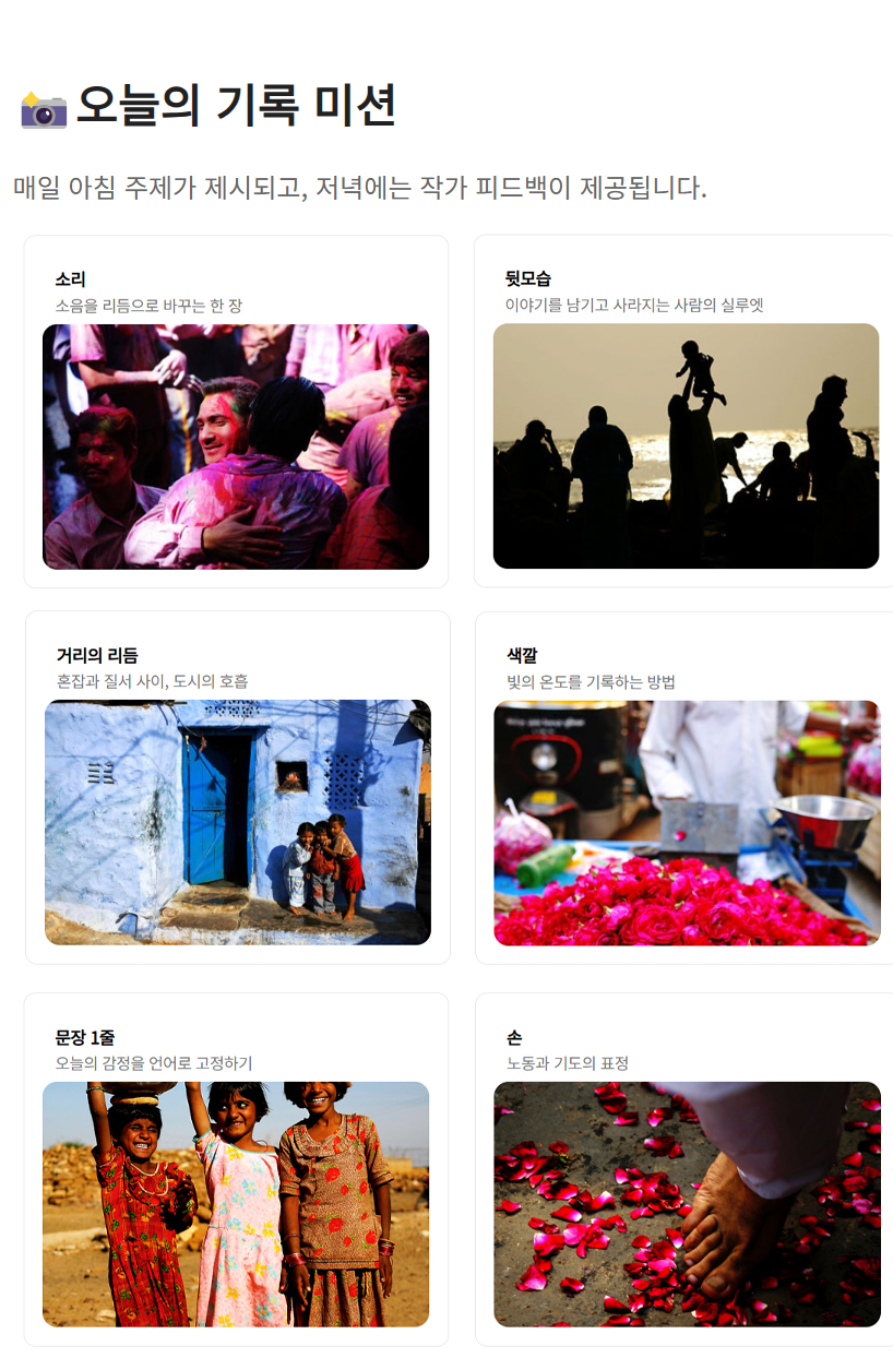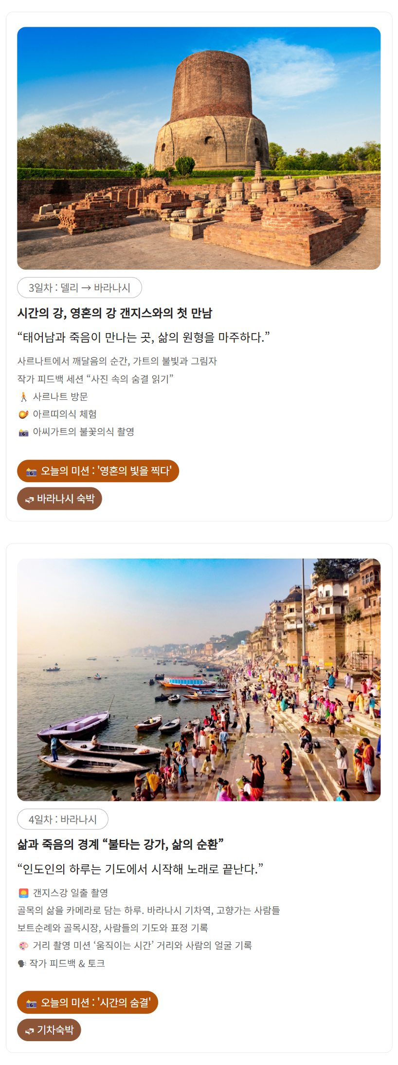 삶과 죽음의 경계 “불타는 강가, 삶의 순환” 🌅 갠지스강 일출 촬영 하루를 시작하는 갠지즈 강변에서의 인도인들의 삶 엿보기 🎨 거리 촬영 미션 ‘움직이는 시간’ 거리와 사람의 얼굴 기록 📸 오늘의 미션 : 시간의 숨결 17:45 바라나시 출발(야간열차)