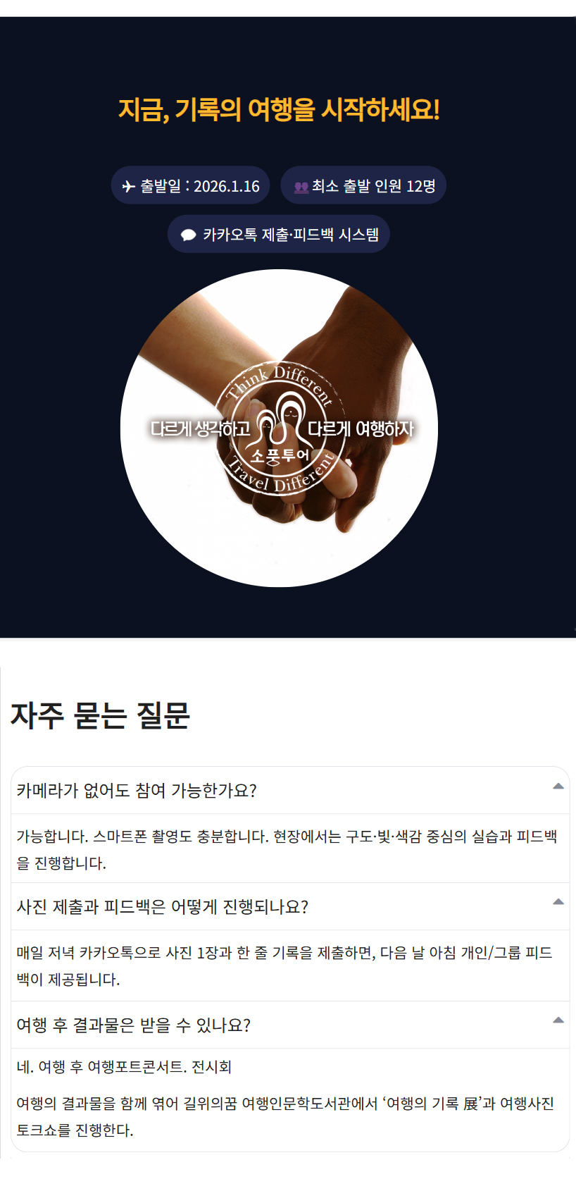 | 상품특전 | 노쇼핑 & 노옵션 전 일정 여행작가 & 사진작가 길벗 동행 현장 실습형 사진 피드백 (구도·노출·색감·편집) 포토에세이 구성 코칭 (사진 선별·문장 다듬기) 여행 후 길위의꿈 여행인문학도서관 포토 토크쇼 &전시회 여행의 기록노트 제공 골든 트라이앵글 5대 유네스코 세계문화유산 및 괄리오르 포트 바라나시 사이클릭샤 투어 바라나시 갠지스강 보트투어 * 상기 이벤트는 현지사정에 의해 변동될 수 있습니다. |