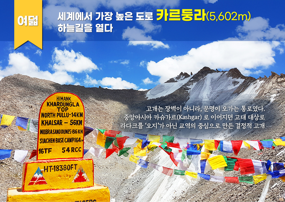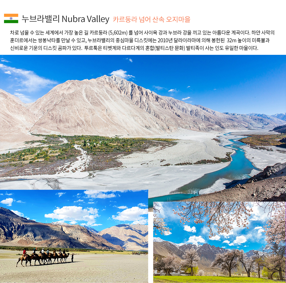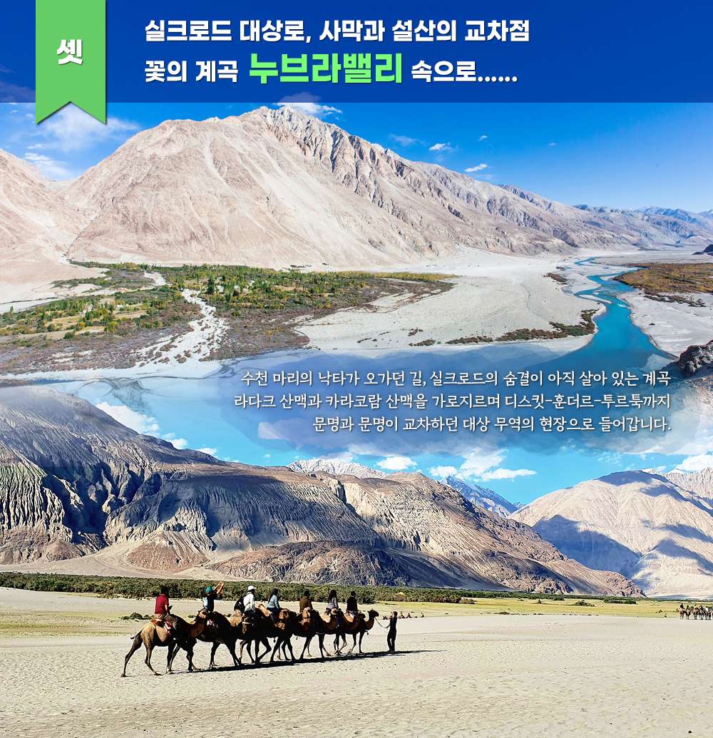 ◎ 수천마리의 낙타가 중앙아시아 카슈카르로 이어지는 대상 무역로 ◎ 눈 덮인 바위산 고개 카르둥라(5,602m, 세계에서 가장 높은 자동차도로) 통과 ◎ '꽃의 계곡’으로 불리우는 누브라밸리 ◎ 캠핑촌 (또는 호텔) 휴식