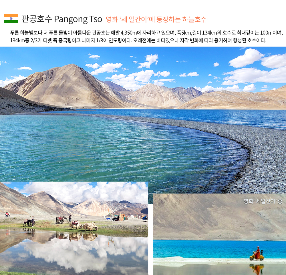 ◎ 사이욕강을 따라 아감 마을, 사이욕 마을 지나 히말라야 오프로드 탐험 ◎ 하늘 물빛을 가득 담은 판공호수로 이동 (약 6시간) ◎ 캠핑촌 휴식 * 판공호수(판공초)는 어떤 곳인가요?