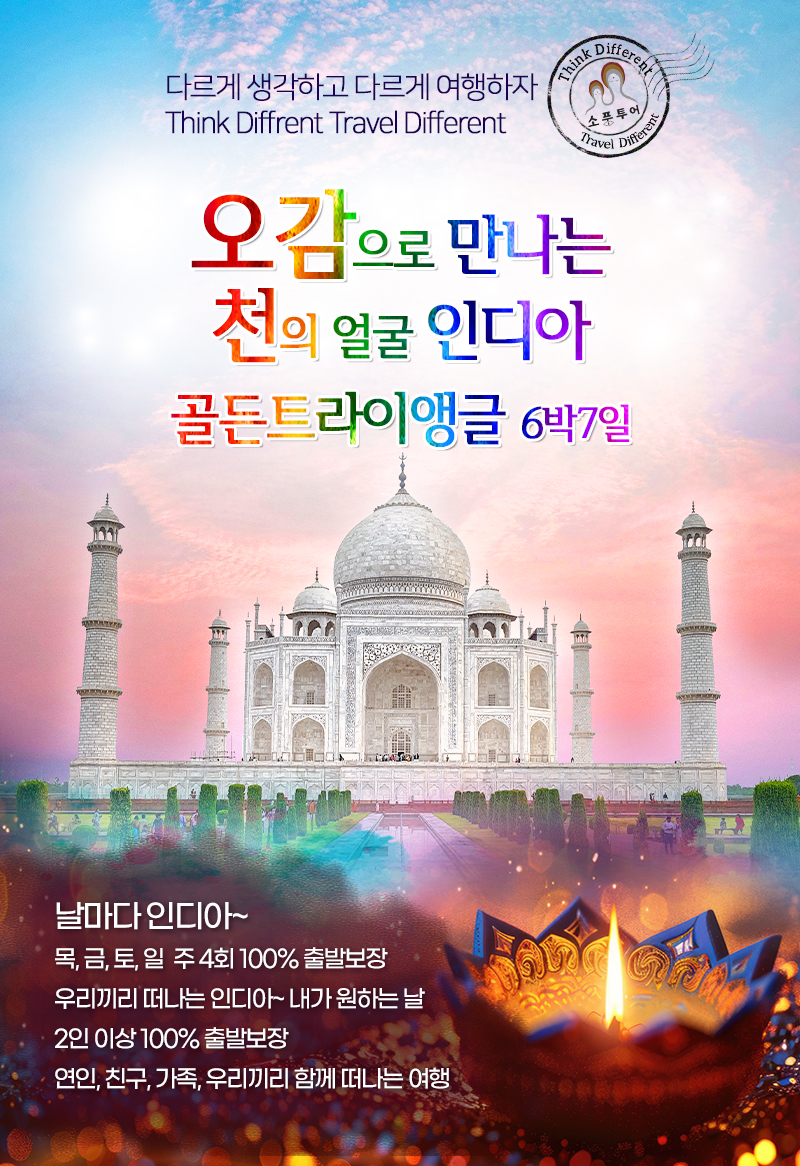 ※ 목, 금, 토, 일 마다 2인 이상 100% 출발합니다. ※ 참가비: 4인 이상 출발시 4월-9월 119만원, 10월 이후 129만원 2인 단독 출발시 1인당 20만원 추가 / 10인 이상 단독팀 할인가능 ※ 10인 이상 단독팀으로 진행할 경우 1인당 119만원 (10만원 할인) ※ 출발 3개월 전 조기 예약시 10만원 할인혜택 ※ 최고 성수기인 10월 - 2월에는 출발일별로 참가비가 상이할 수 있습니다. ◈ 항공권과 인도관광비자는 소풍투어에서 실시간으로 예약을 대행해 드립니다. ◈ 타지마할 보름달 야간투어는 인원제한이 있으므로 조기예약이 필수입니다. (금요일과 라마단기간엔 진행되지 않습니다. ) | ||